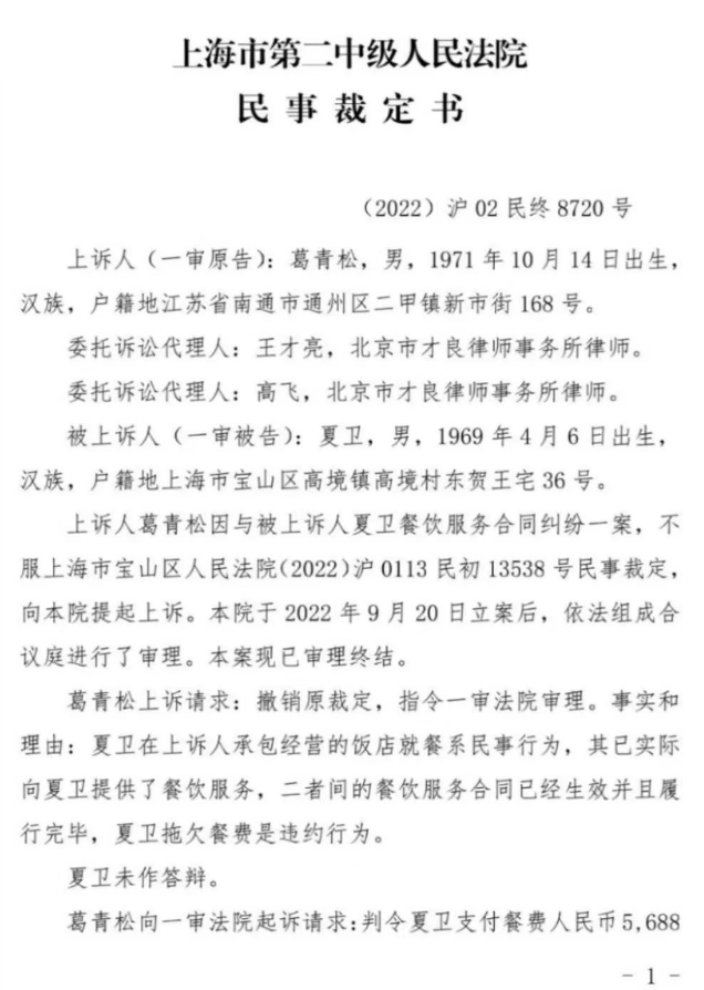 上诉人葛青松因与被上诉人夏卫餐饮服务合同纠纷一案,不服上海市宝山区人民法院(2022)沪0113民初13538号民事裁定,向本院提起上诉。本院于2022年9月20日立案后,依法组成合议庭进行了审理。本案现已审理终结。