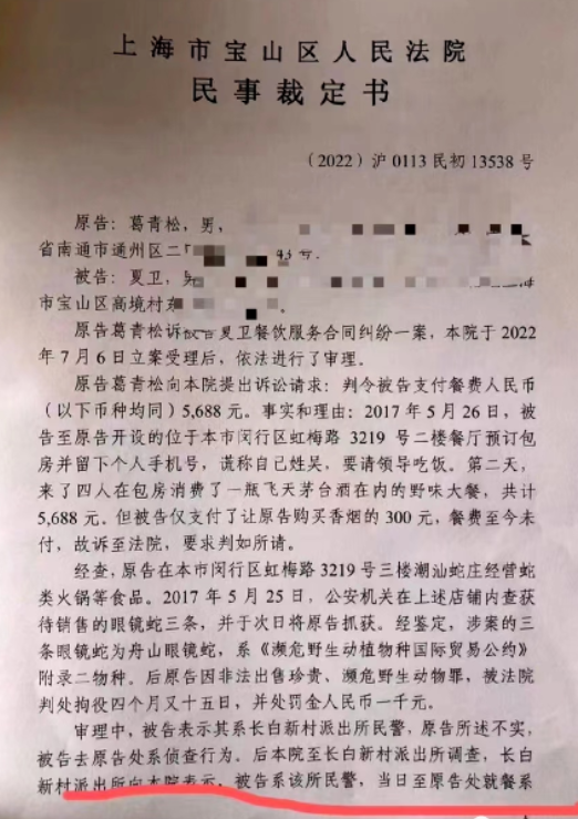 阅读链接:民警吃野味喝茅台不付钱,法院一审裁定:不属民事案件!
