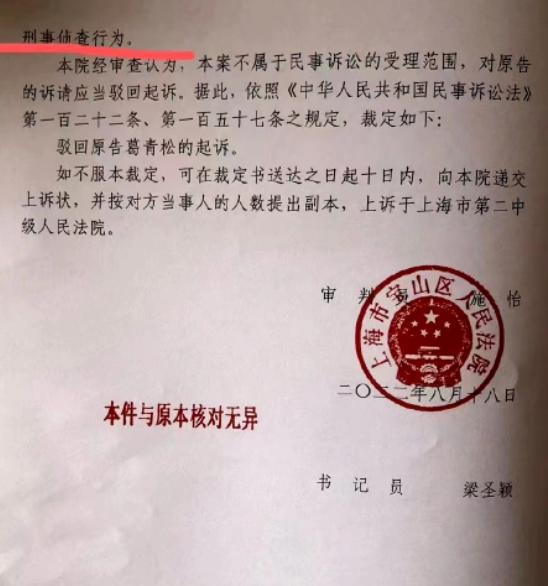 一、撤销上海市宝山区人民法院(2022)沪0113民初13538号民事裁定;